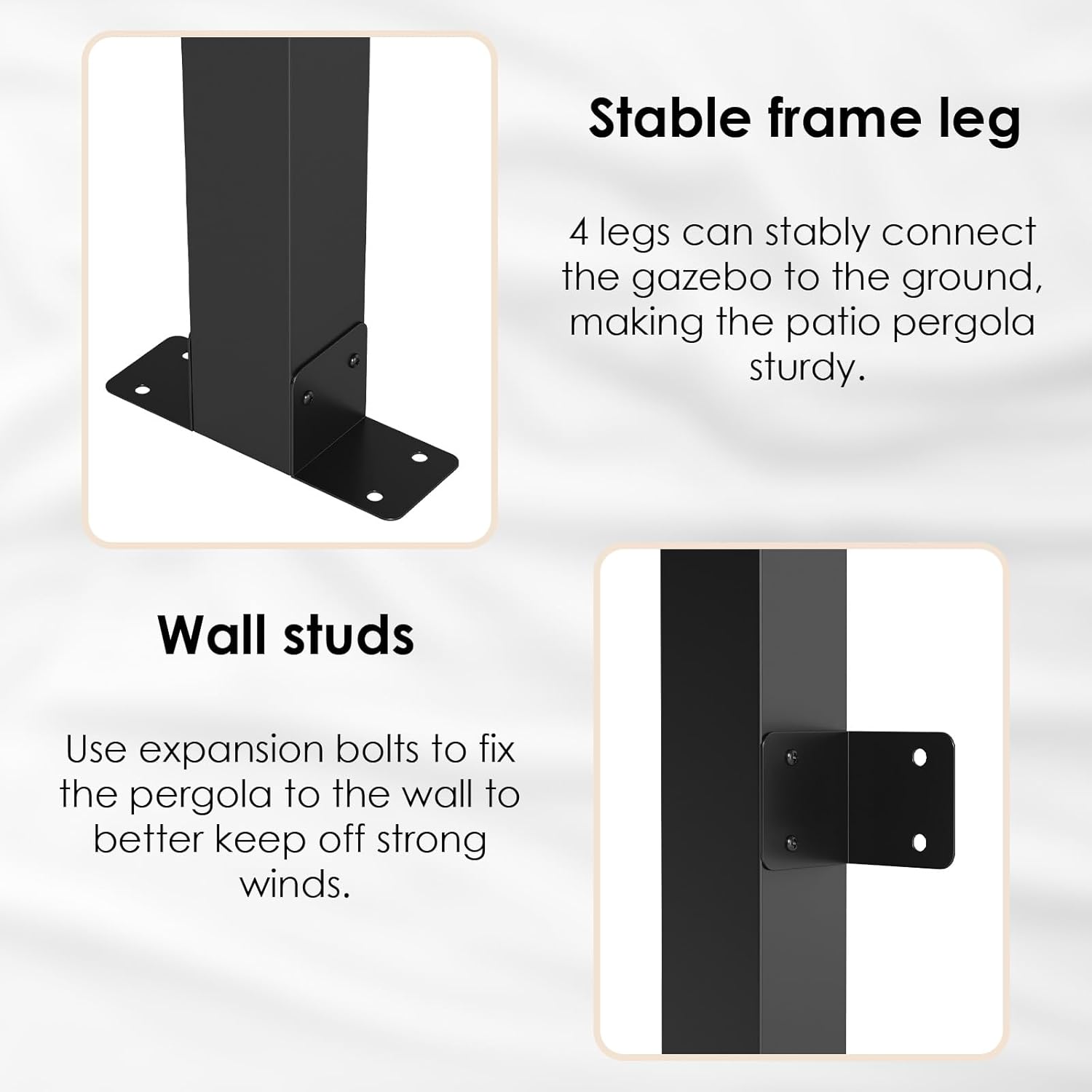 - Good load-bearing capacity:Pergola is good at bearing loads,can withstand about 7 inches of heavy snow, and can cope with all weather conditions excellently. Unlike traditional freestanding gazebos, it can be fixed to the wall and the ground with nails. Once fixed, it can confidently withstand wind speeds of about 30-60 miles per hour