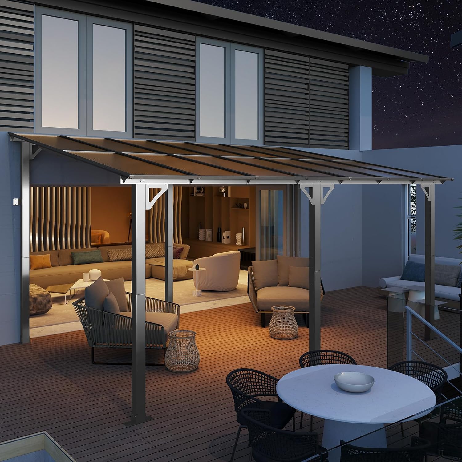 - Good shelter: Sturdy roof of the lean to gazebo is made of polycarbonate panels, which can block harmful ultraviolet rays while transmitting light, keeping you and your outdoor furniture away from the sun. Sloped roof design can drain water quickly and effectively block rainwater from entering the outdoor pergolas, allowing you to enjoy a leisurely afternoon tea even in the rain