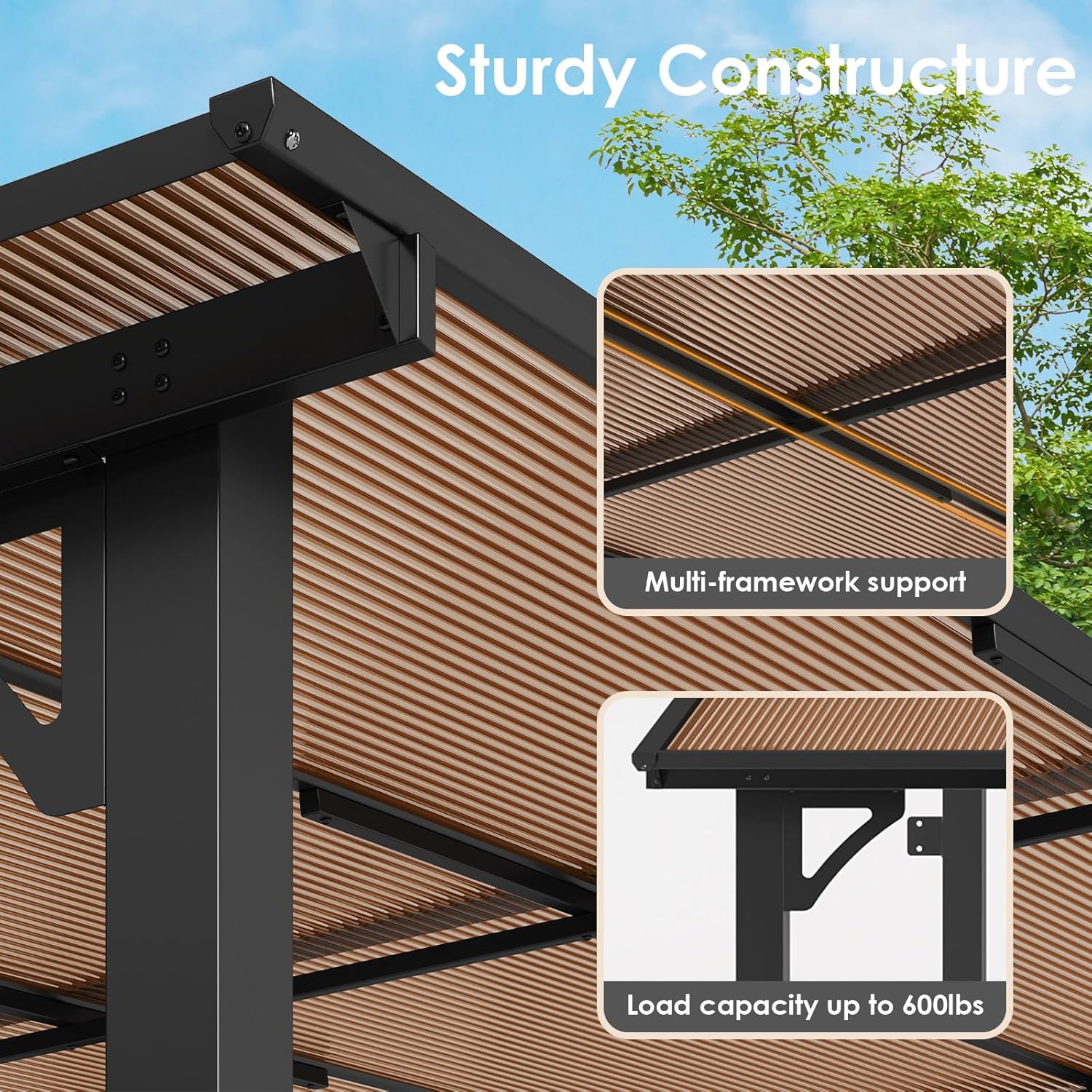 - Stable frame: Material uses steel and aluminum frames, which are stable and durable. Triangular metal frame on all four sides of the frame can make the structure of the louvered pergola stronger and increase stability. Patio gazebo provides good shelter from sunlight, wind, rain and snow, and is covered from various weather factors