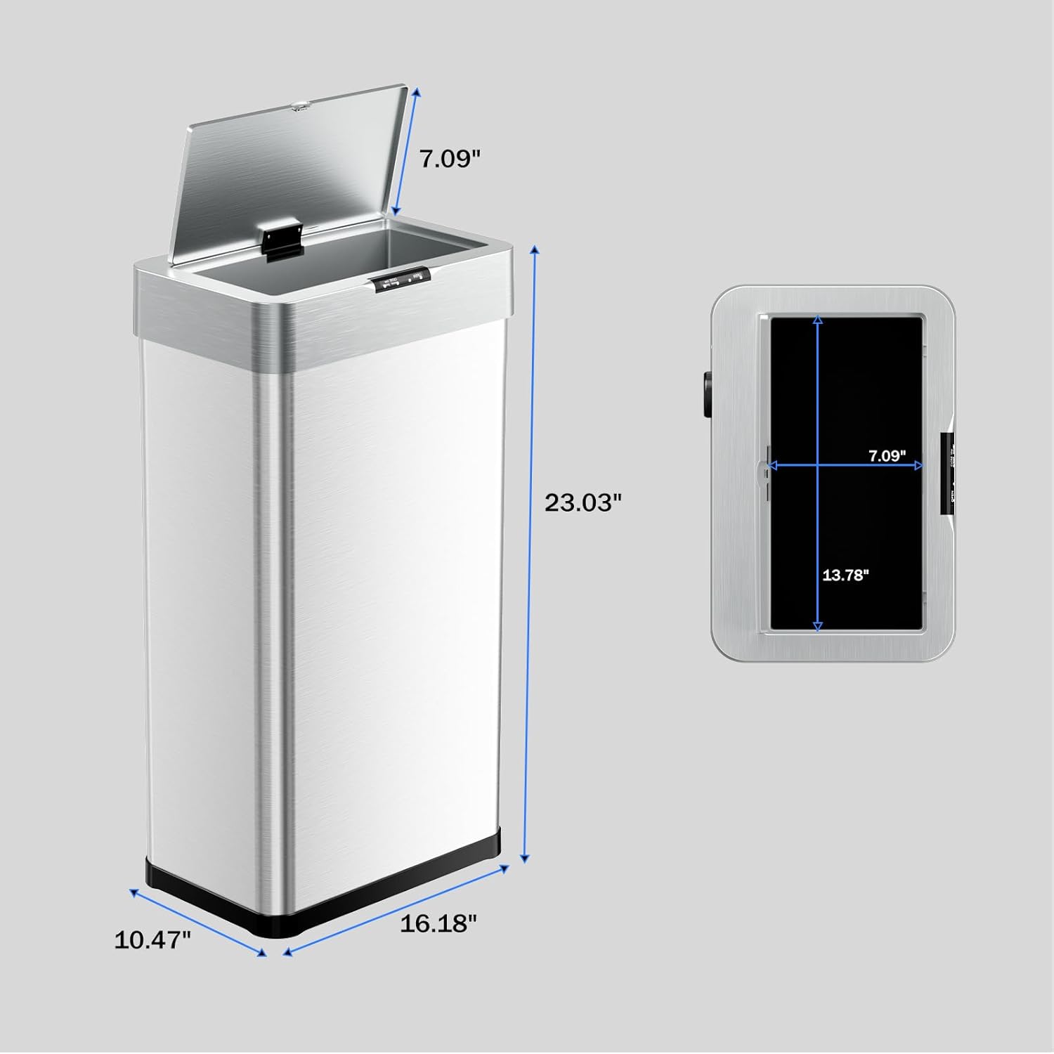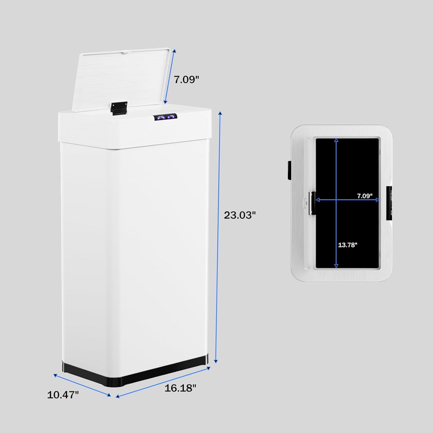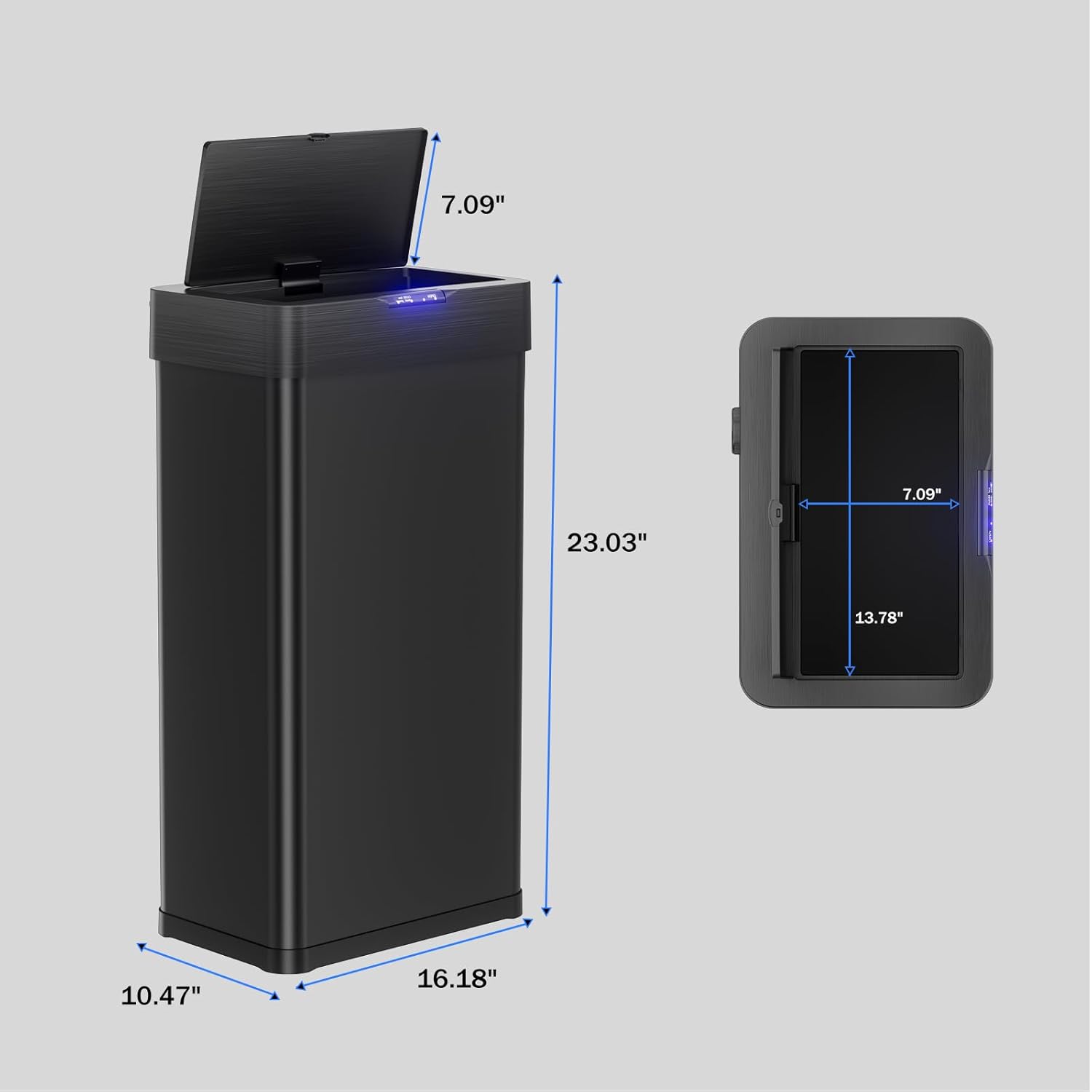 - 【Soft-Close Lid and Integrated Design】Sensor trash can lid has a slow-closing function, ensuring each closure is gentle and quiet, reducing noise and disturbance to nearby people while also enhancing the trash can's sealing ability. Trash can opening measures 13.78 × 7.09 inches, making it easy to deliver even large item.