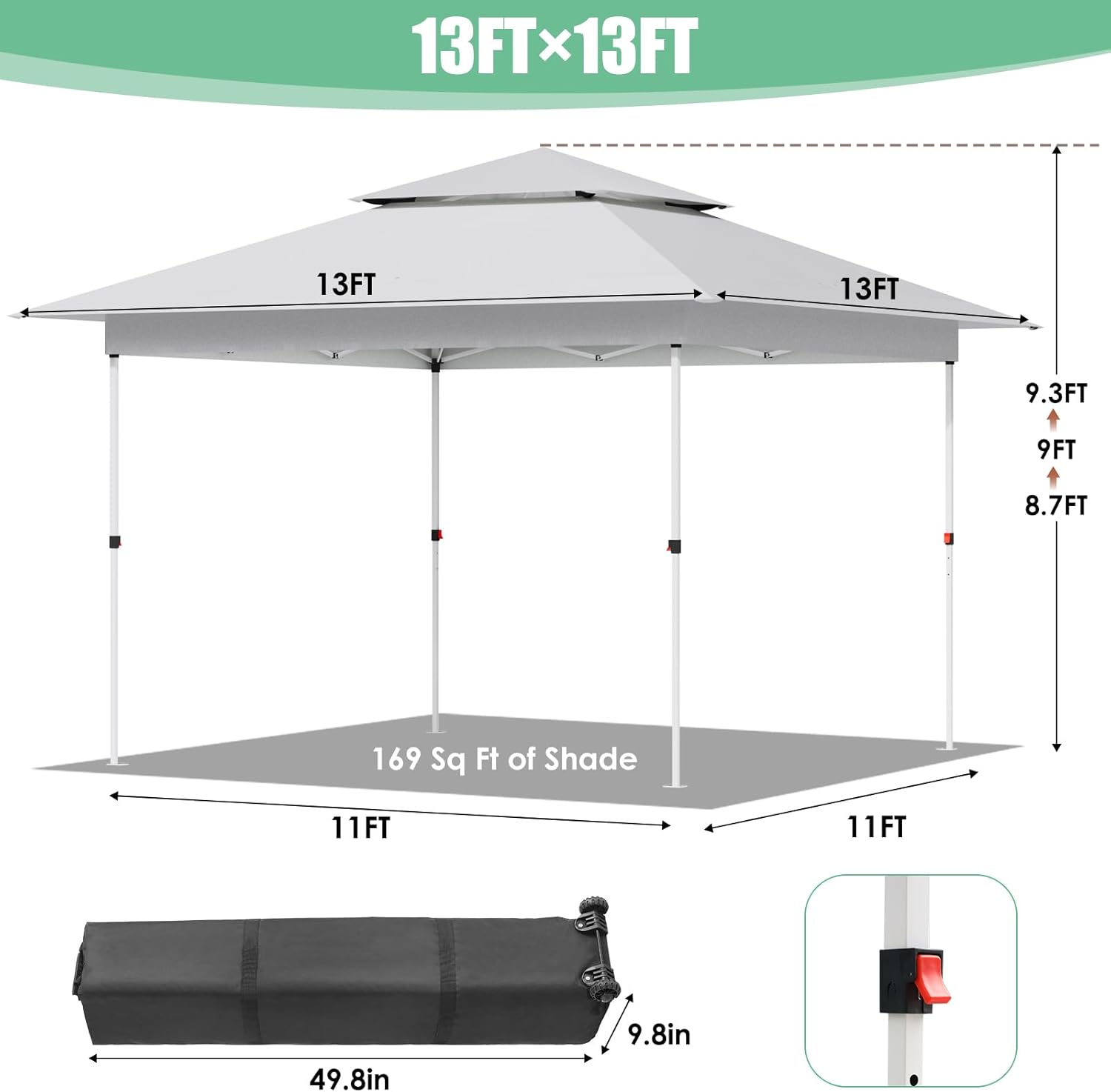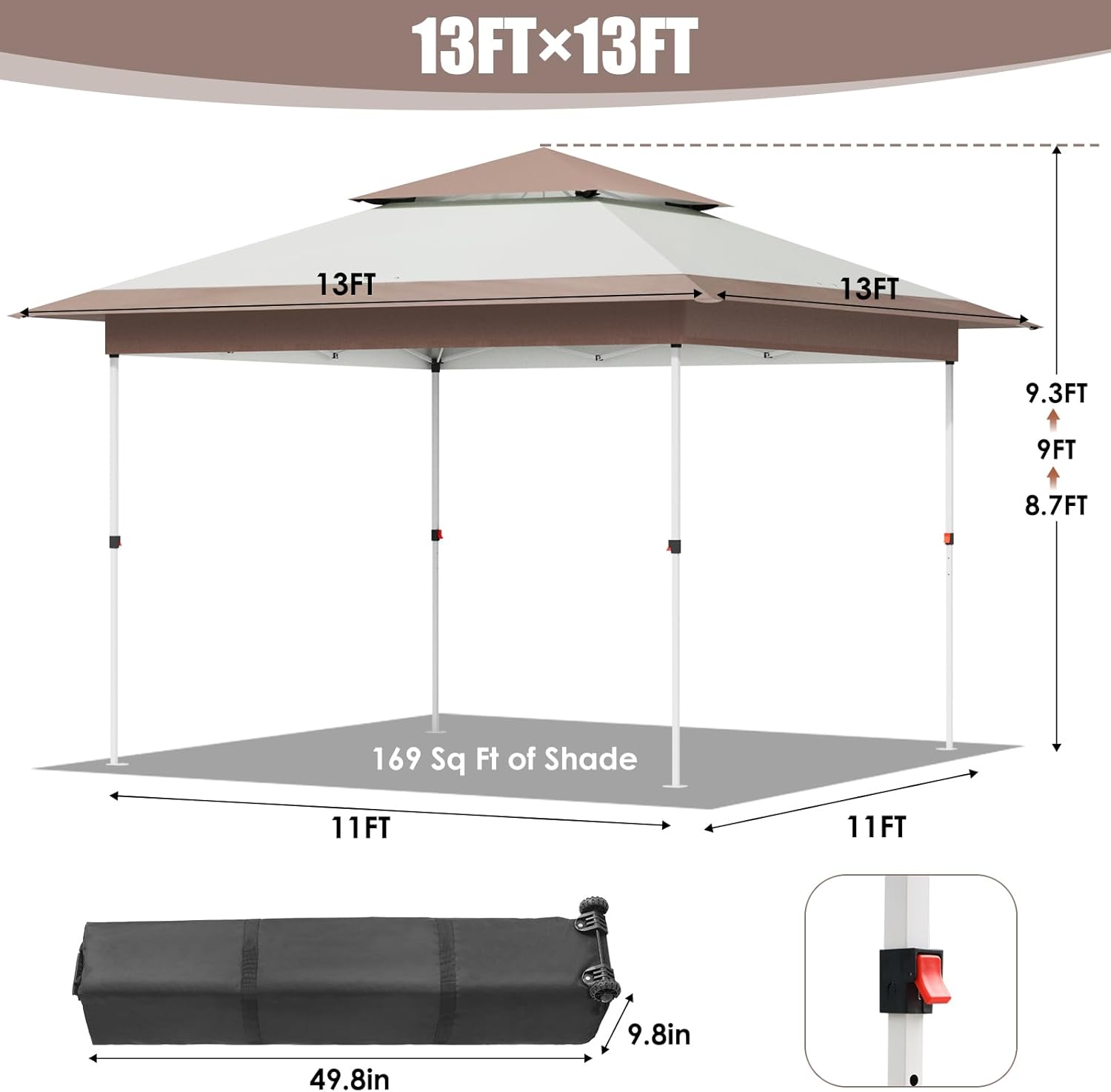 - LAZY BUDDY 13x13ft Pop up canopy tent features a quick-install one-button center locking technology, which allows one person to set up or release the tent easily and quickly. The pop up tent has 3 levels of height adjustment for different needs.