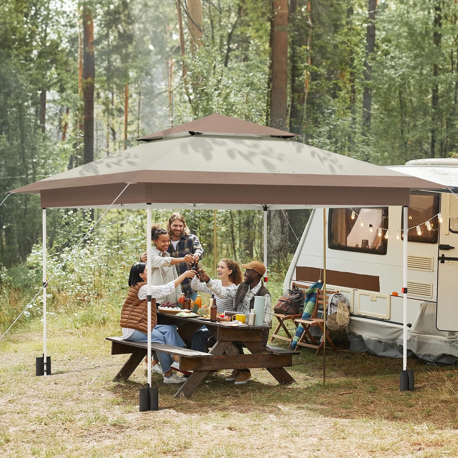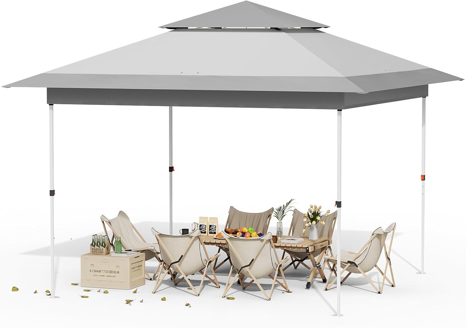 LAZY BUDDY 13'x13' pop-up canopy is crafted from 420D Oxford fabric and coated steel frames, offering enhanced stability and durability for prolonged use. This pop up tent features a double-layer roof ensuring excellent ventilation and stability.