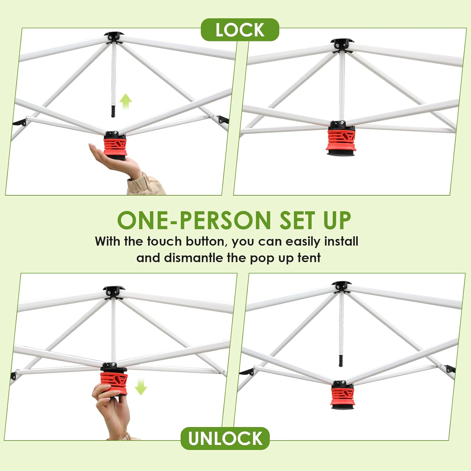LAZY BUDDY pop-up gazebo utilizes one-button central locking technology that allows for quick assembly and disassembly by a single person.