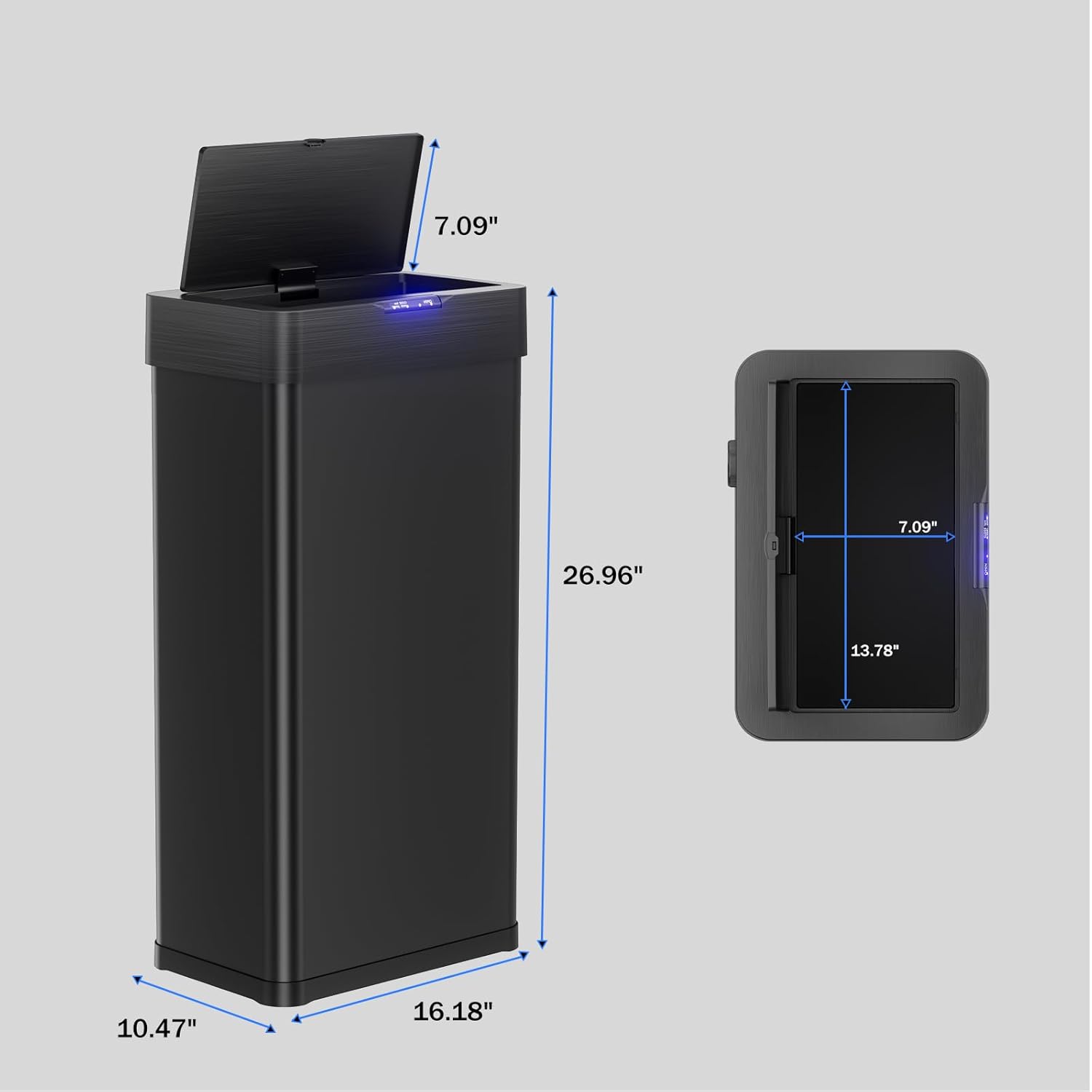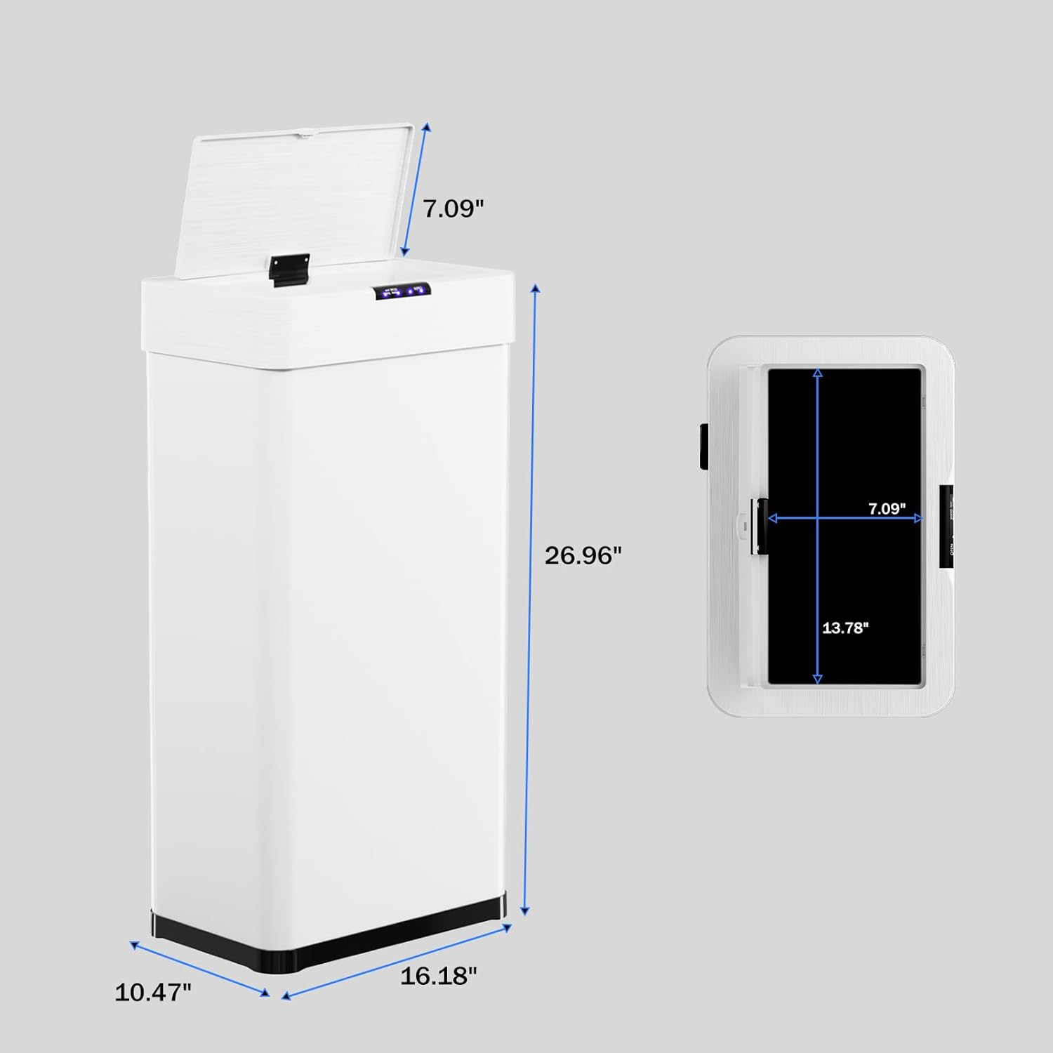 - 【Soft-Close Lid and Integrated Design】Sensor trash can lid has a slow-closing function, ensuring each closure is gentle and quiet, reducing noise and disturbance to nearby people while also enhancing the trash can's sealing ability. Trash can opening measures 13.78 x 7.09 inches, making it easy to deliver even large items