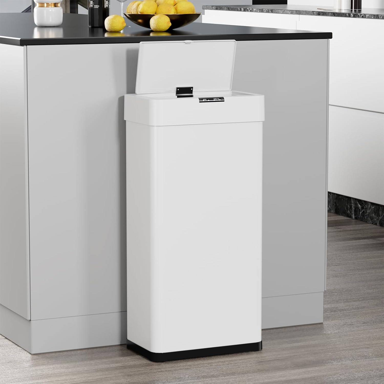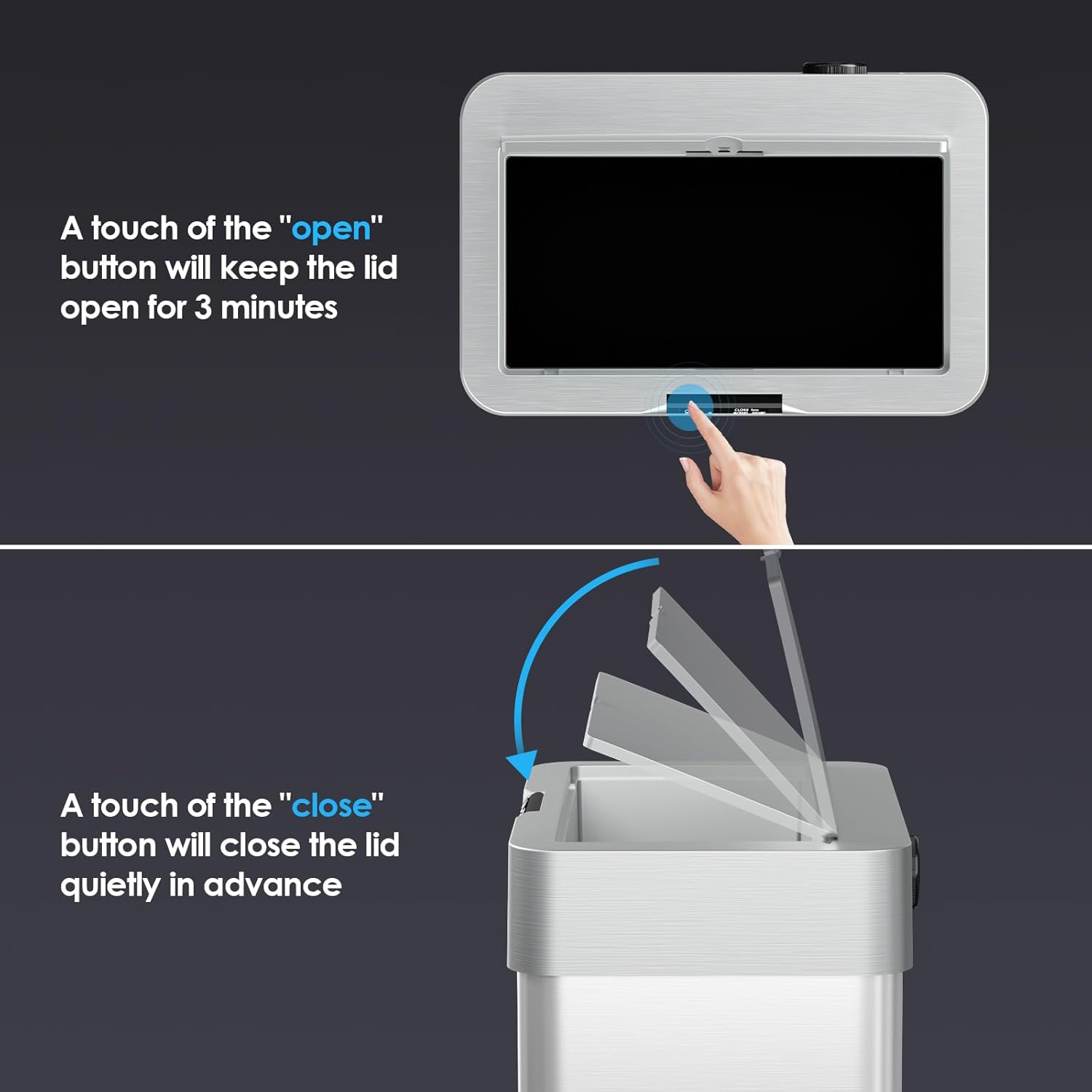 - 【Sensing and Button Mode】16 gallon automatic trash can has sensing area of up to 5.9 inches and can detect motion in just one second to open. It will automatically close after nine seconds. If you need trash can to remain open for extended time, you can touch the "open" button to keep it open for three minutes. Touching the "close" button allows you to close trash can immediately without waiting