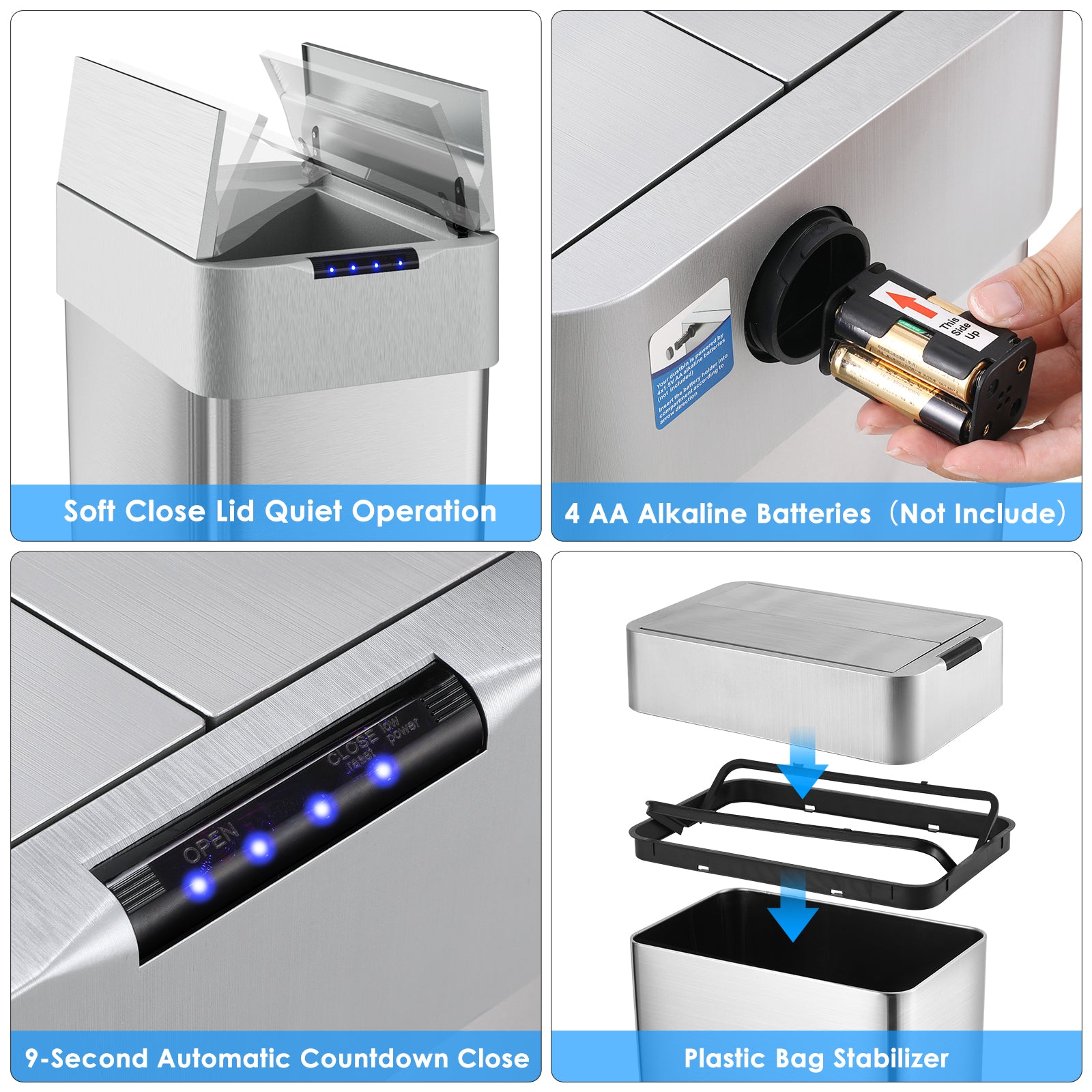 - POWER OPTIONS: Powered by 4*1.5v AA size batteries for continuous power for large trash cans with lid. Consumers need to purchase 4*1.5v AA batteries (not included) to install and use it by themselves.