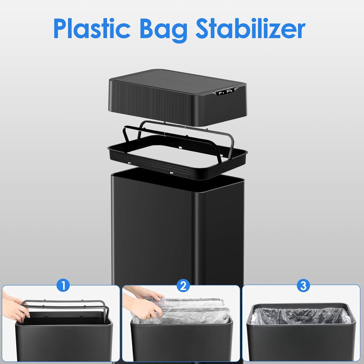 - Large Capacity: Sensor trash can has a 13.2 gallon capacity. Smaller capacity is ideal for compact spaces, while larger capacity can accommodate more trash, saving you time and energy. Trash bag fixing rings keep trash bags neatly stowed while providing the stability you need when disposing of trash without them slipping off easily