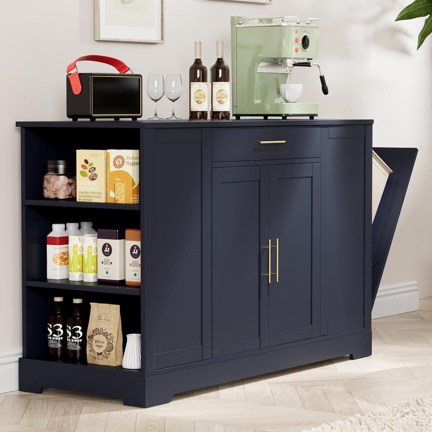 LAZY BUDDY Stylish and Practical 53-inch Large Kitchen Island With 13 Gal Tilt Out Trash Can Holder will change your kitchen experience! A variety of storage spaces meet your daily needs.