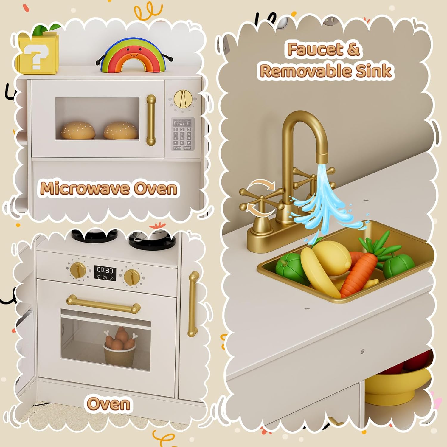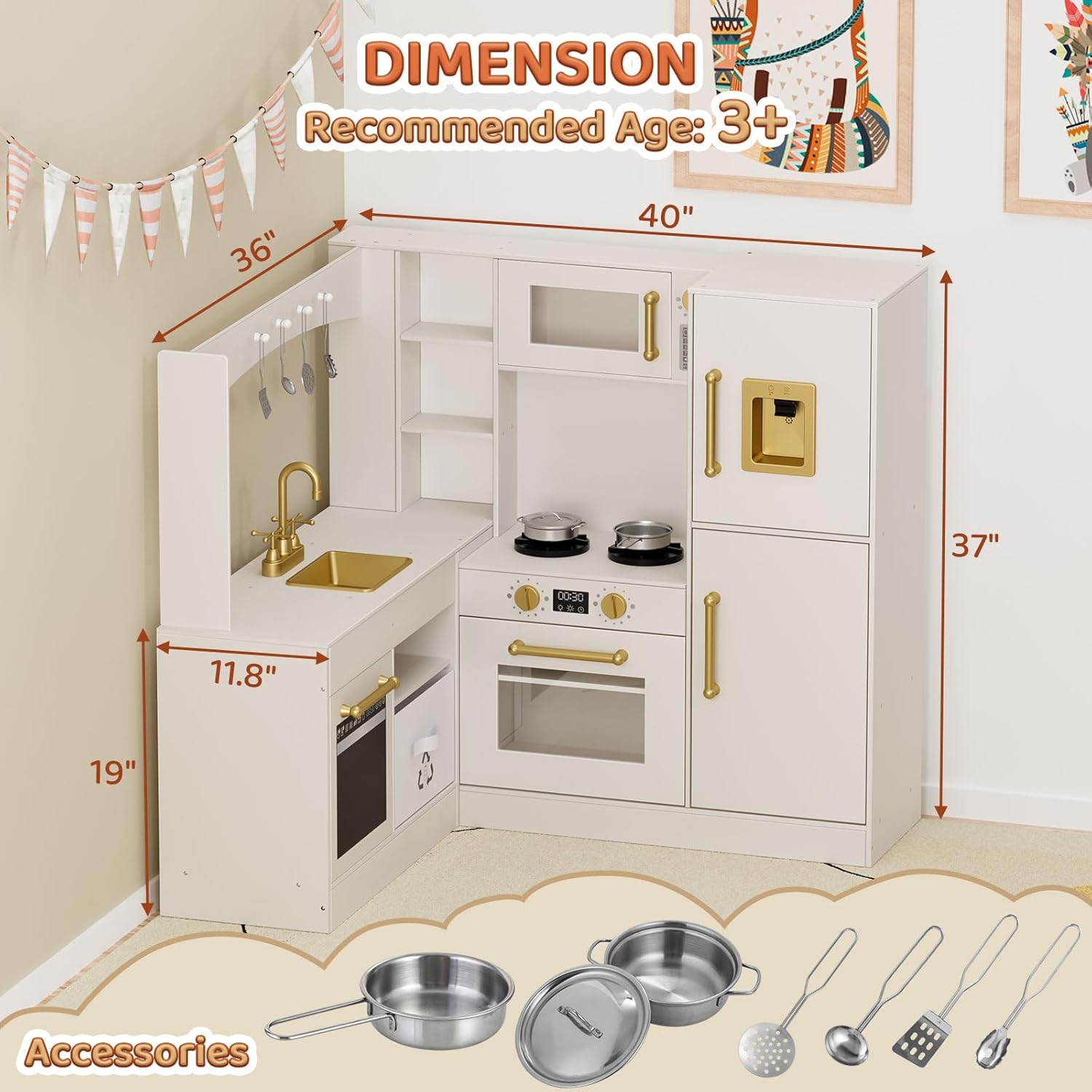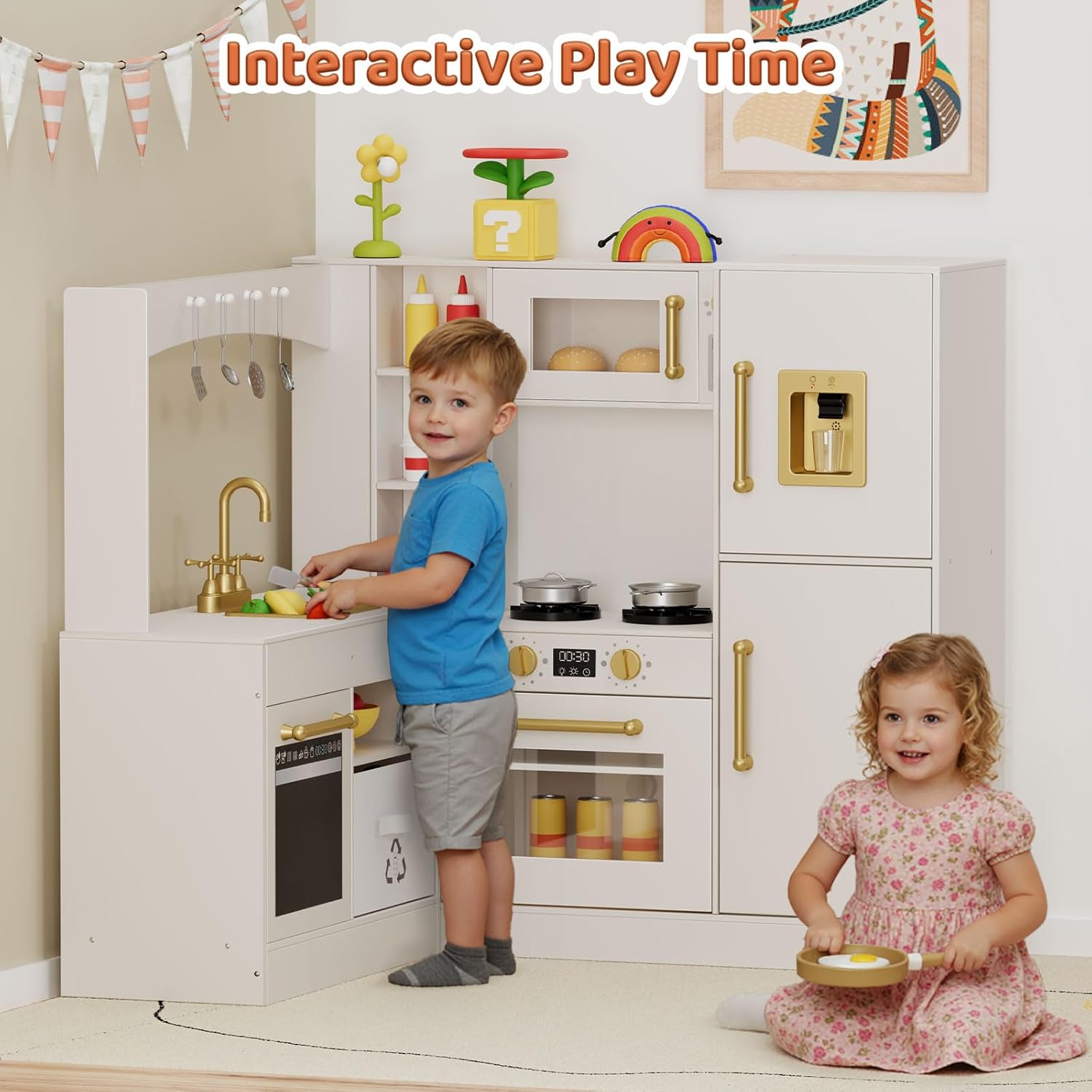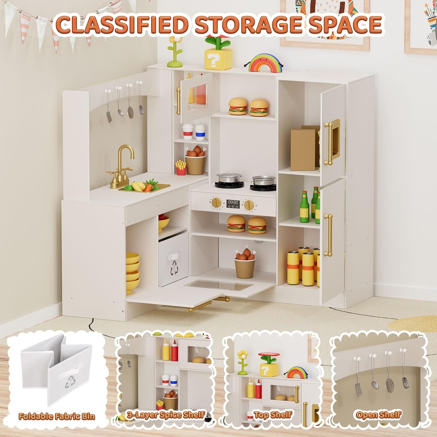 LAZY BUDDY Corner Wooden Play Kitchen w/ Lights & Sounds, Large Toodler Cooking Playset, Pretend Play Kitchen Toy Gift for Ages 3+