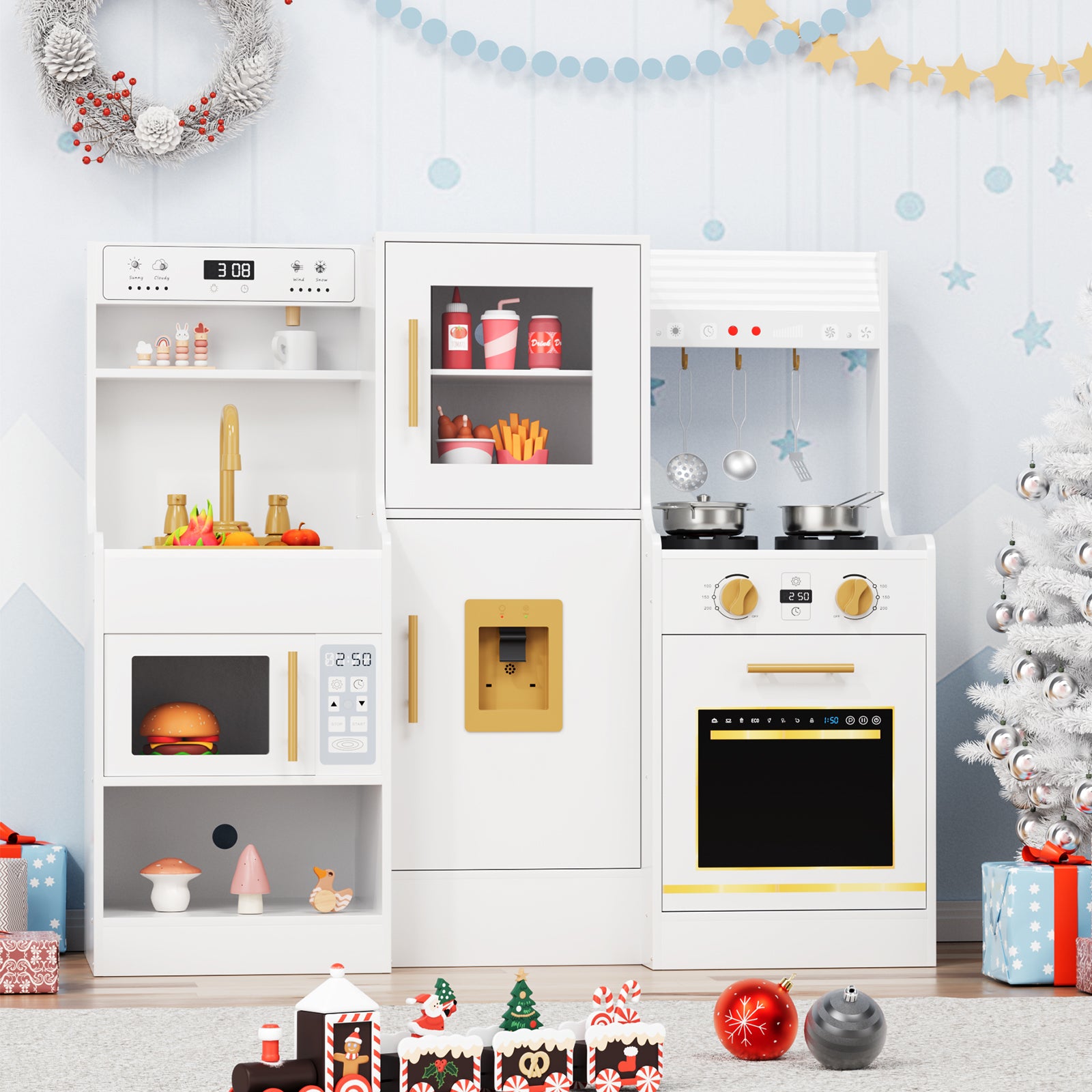 - LAZY BUDDY kids kitchen is equipped with a stove, microwave, oven, water dispenser, range hood, sink, and storage cabinet; both the water dispenser and range hood feature simulated light and sound to create a realistic kitchen atmosphere (requires AAA batteries, not included).