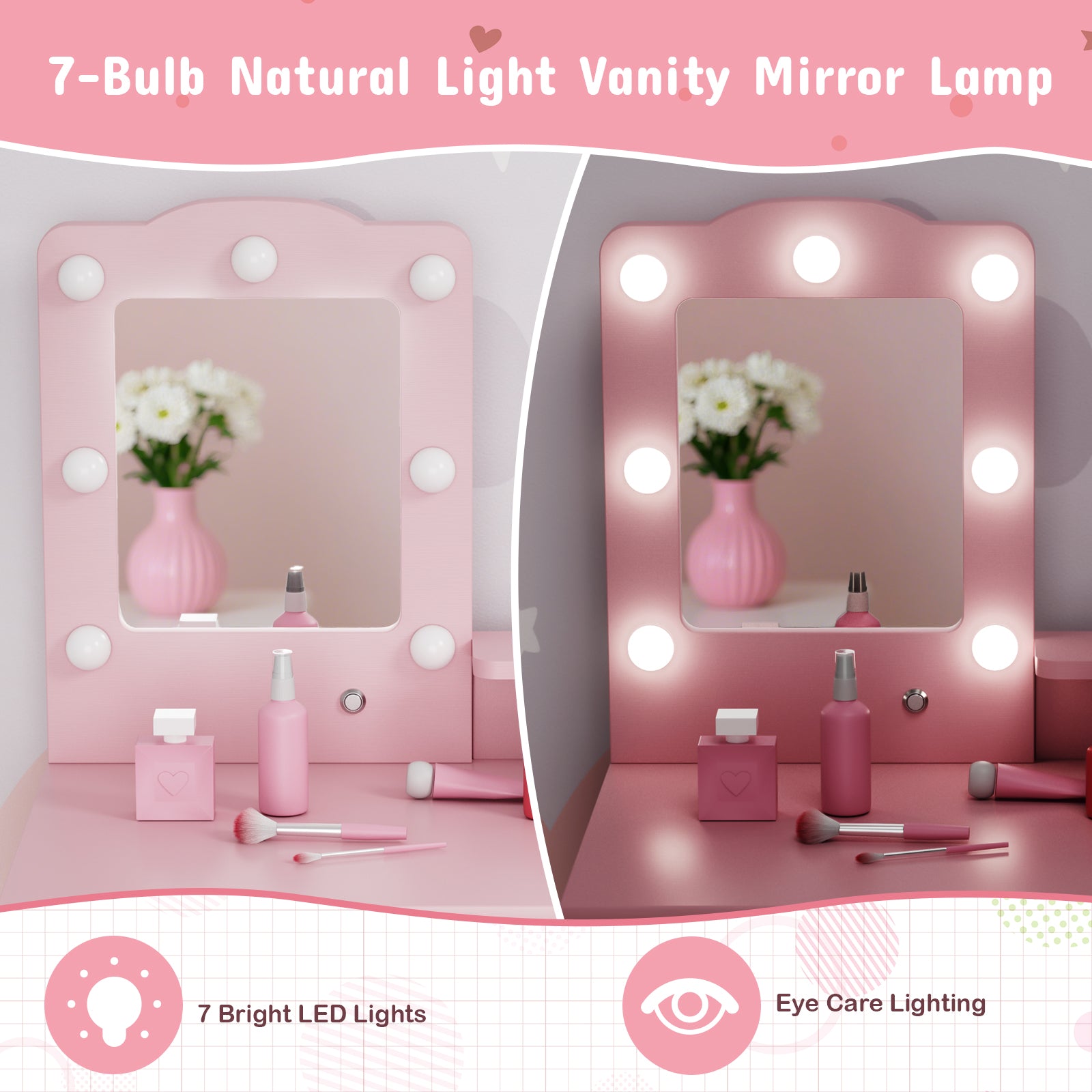 - Toddler vanity set features 7 soft-glowing LED bulbs and a crystal-clear, shatterproof acrylic mirror to provide perfect illumination for makeup play, sparking endless imaginative and role-play adventures.