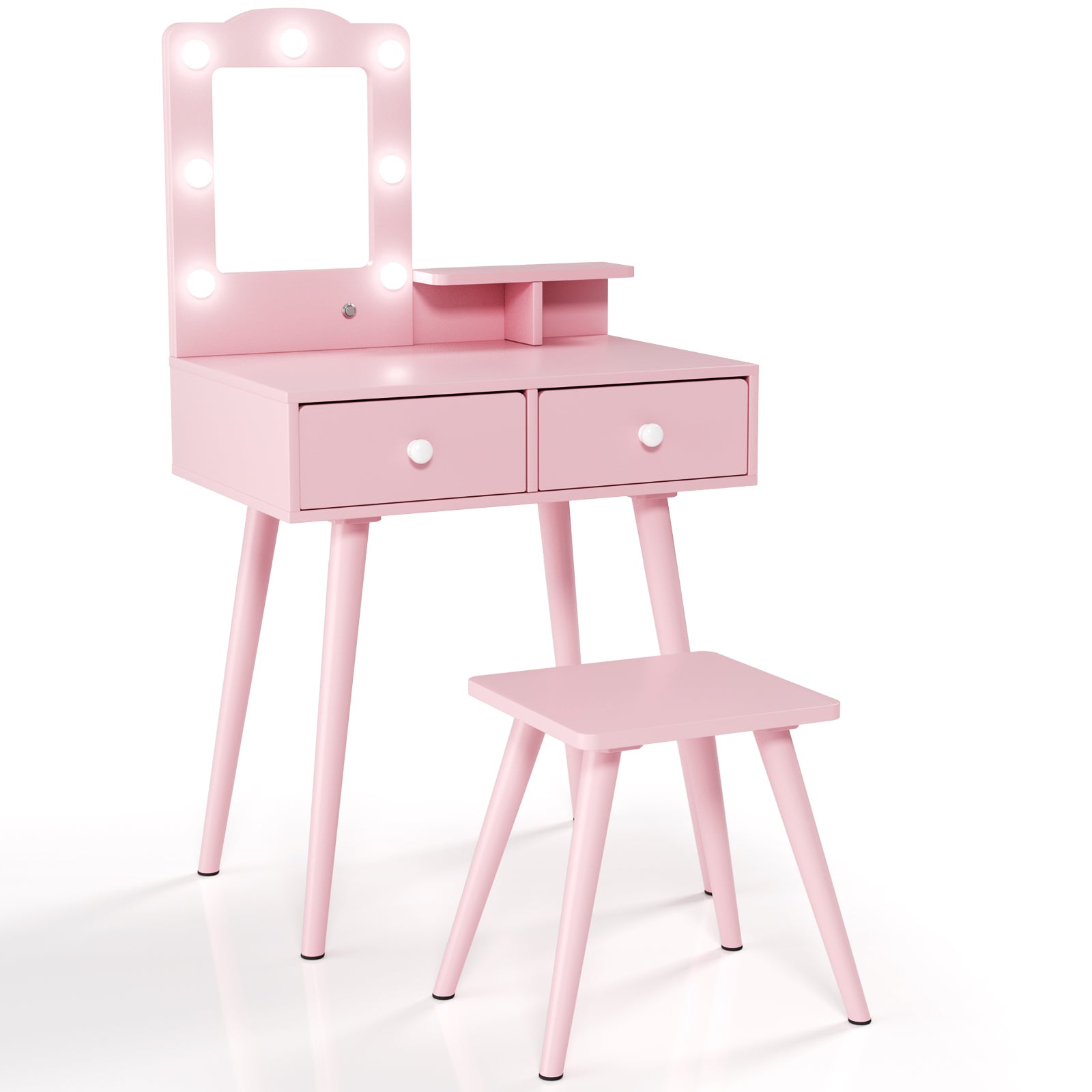 LAZY BUDDY Kids Vanity Set with Lights, Toddler Vanity Table with Mirror and Stool, Wooden Makeup Dressing Table for Children 3+